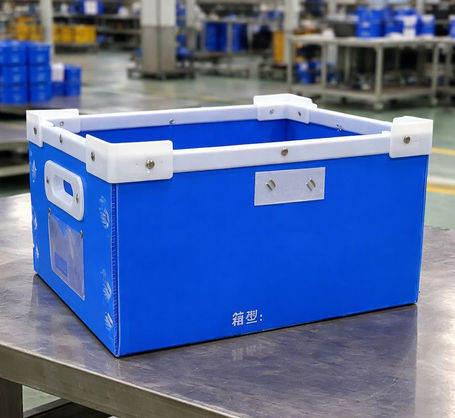 Reusable blue corrugated plastic box with reinforced edges and handles, lightweight yet durable, designed for safe storage and repeated industrial logistics use.